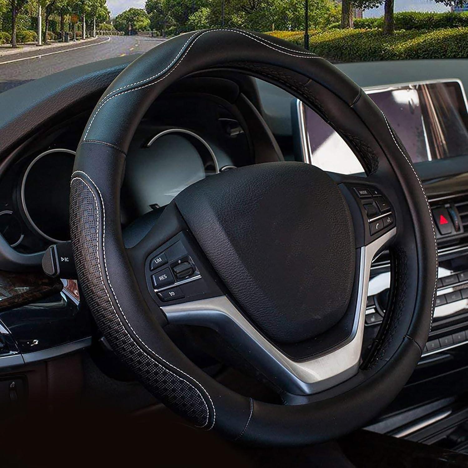 Valleycomfy Steering Wheel Covers Universal 15 inch – Genuine Leather, Breathable, Anti Slip & Odor Free (Black with Black Lines, M(14″ 1/2-15″ 1/4))(Black with Black Lines)