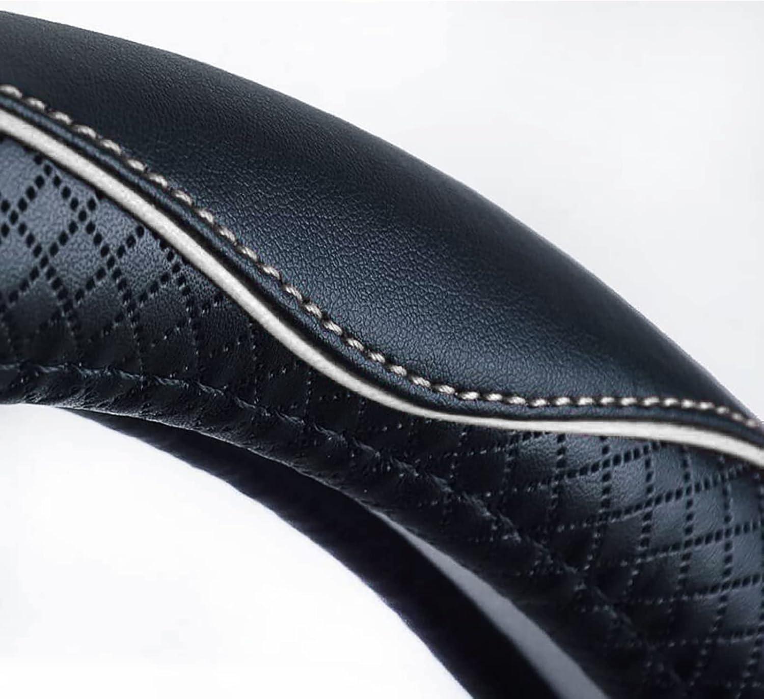 Valleycomfy Steering Wheel Covers Universal 15 inch – Genuine Leather, Breathable, Anti Slip & Odor Free (Black with Black Lines, M(14″ 1/2-15″ 1/4))(White Line)